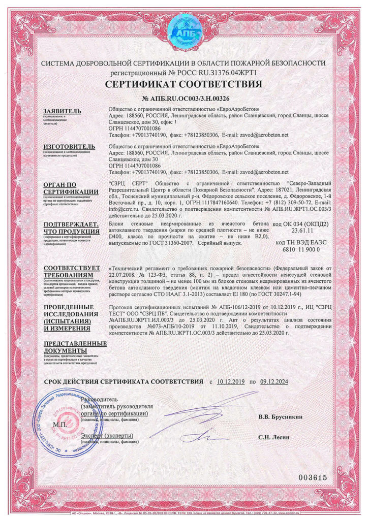Сертификаты газобетона